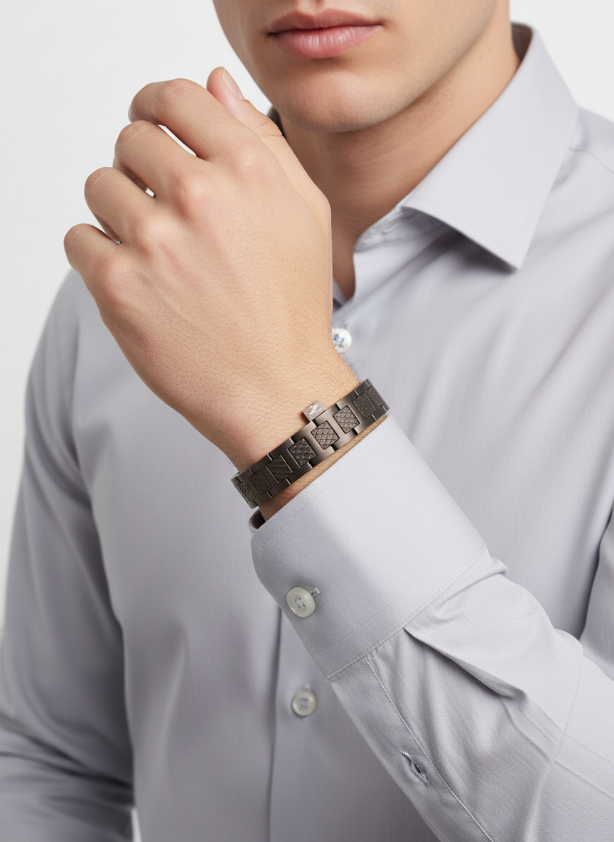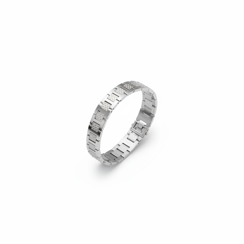 🔹 التصميم: مكوَّن من وصلات معدنية مربعة الشكل مع نقش هندسي مميز في المنتصف، يعطيه طابعًا عصريًا وفخمًا.