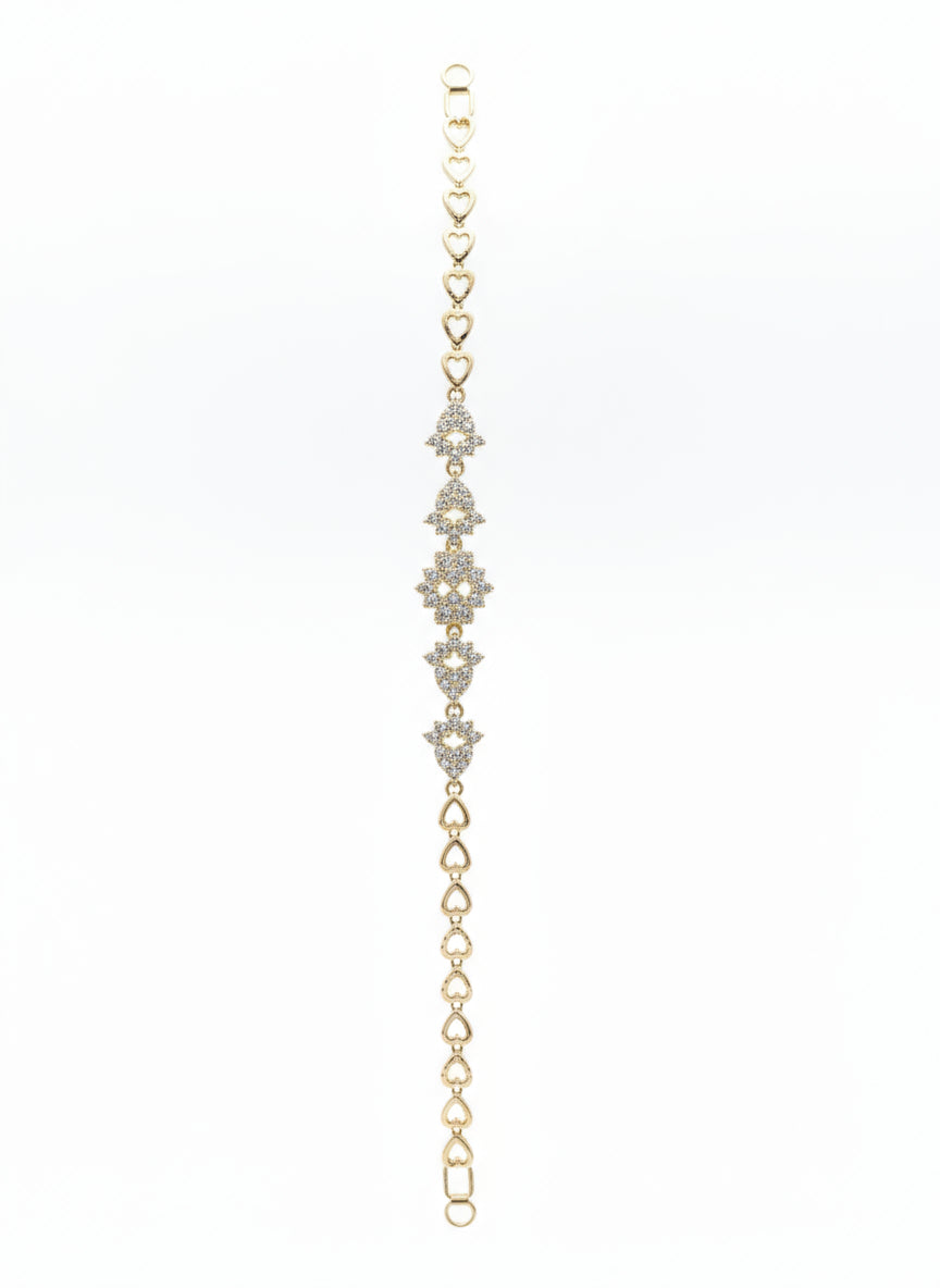 الجزء الأوسط يحتوي على أشكال زخرفية مرصعة بفصوص لامعة (شبيهة بالزركون) تضيف بريقًا وأناقة.
