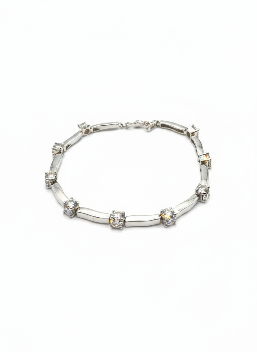 💫 التصميم: مكوّن من حلقات معدنية قصيرة متصلة، تتخللها أحجار لامعة (تشبه الزركون أو الألماس الصناعي) موزعة بالتساوي حول السوار.