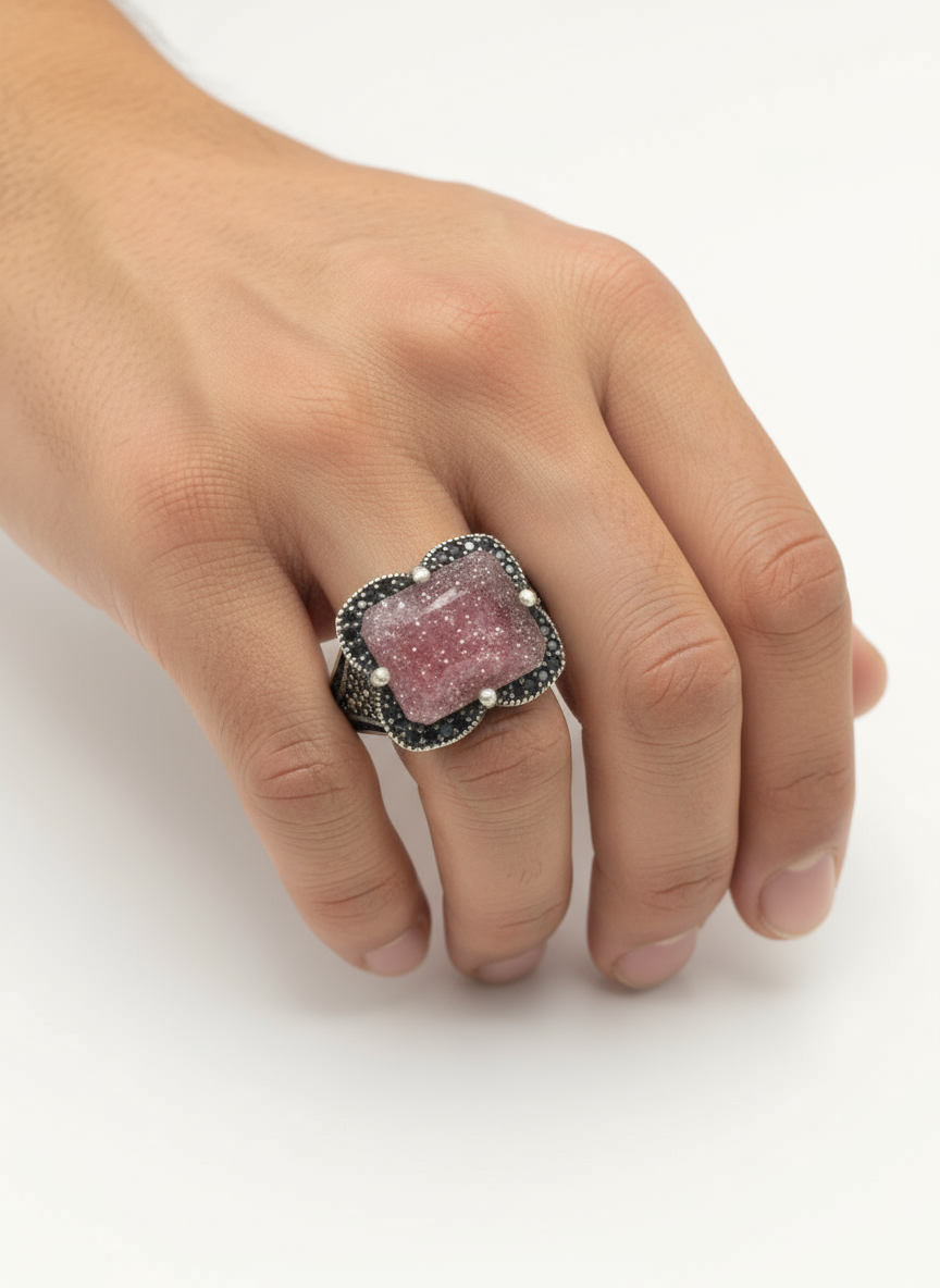 🔹 الفص: حجر طبيعي أو صناعي بلون بني مائل إلى النبيذي أو الأحمر الغامق مع بريق خفيف داخلي، ما يرجح أنه من أنواع: