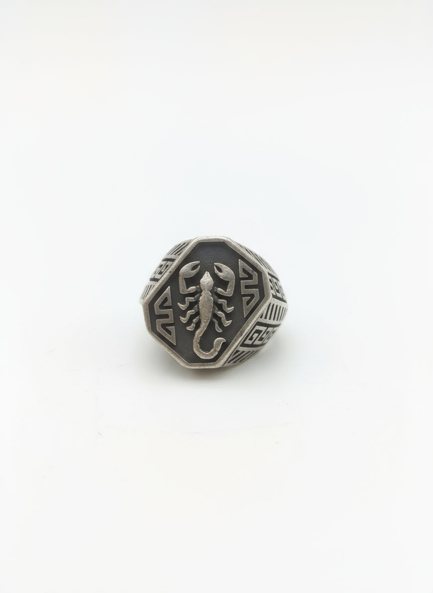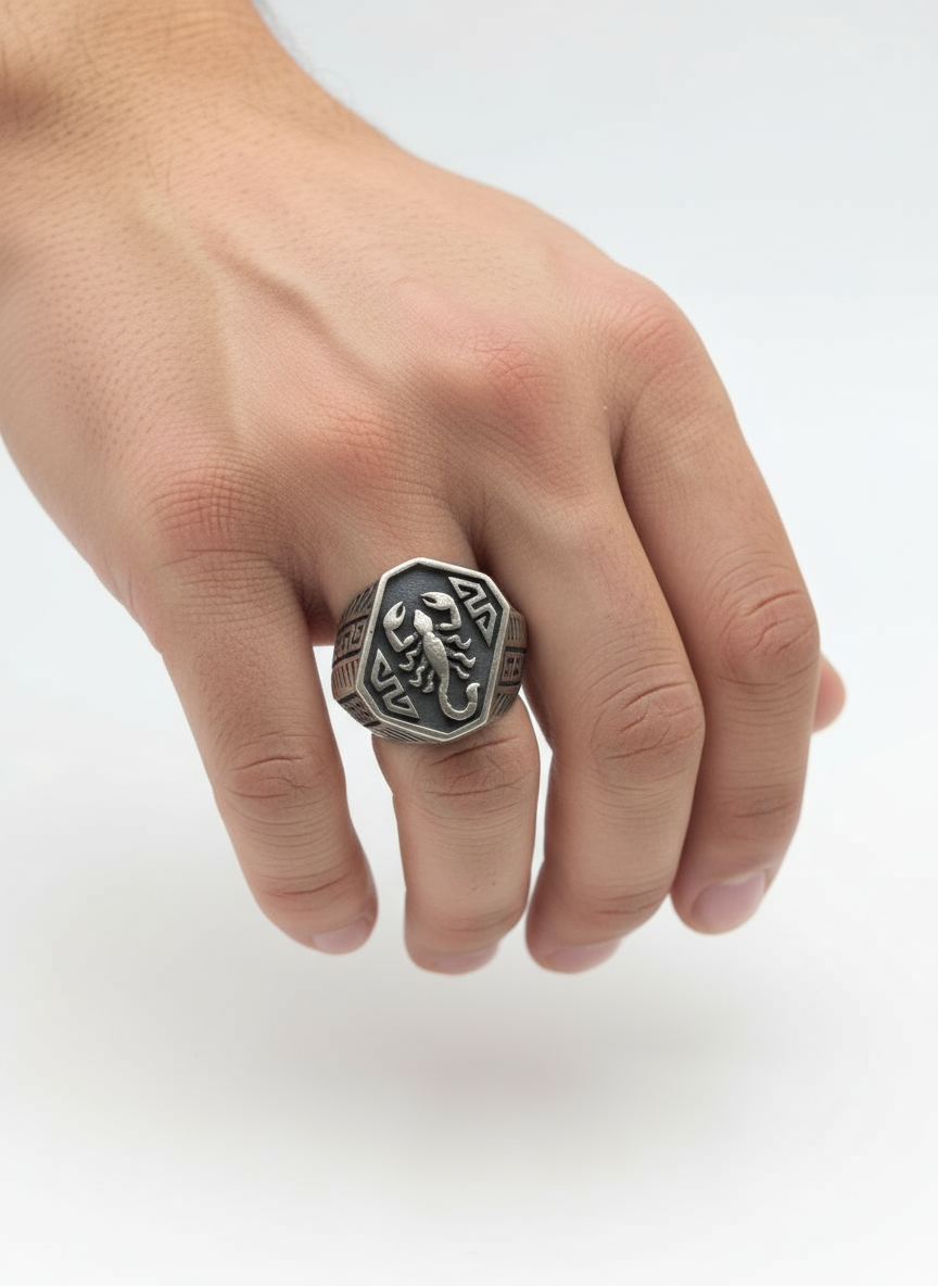 يتوسطه نقش لعقرب بارز على وجه سداسي الشكل، وهو يرمز عادةً إلى القوة، والجرأة، والحماية.