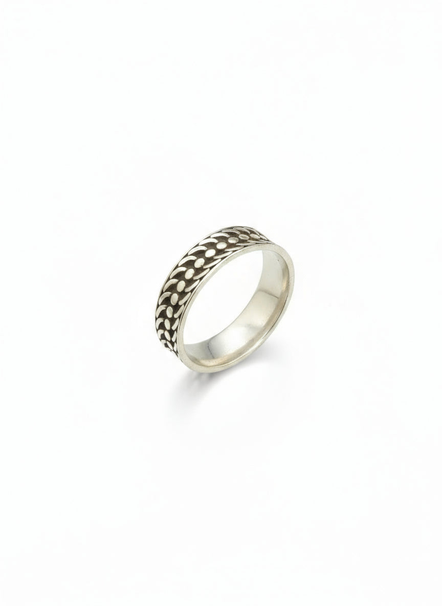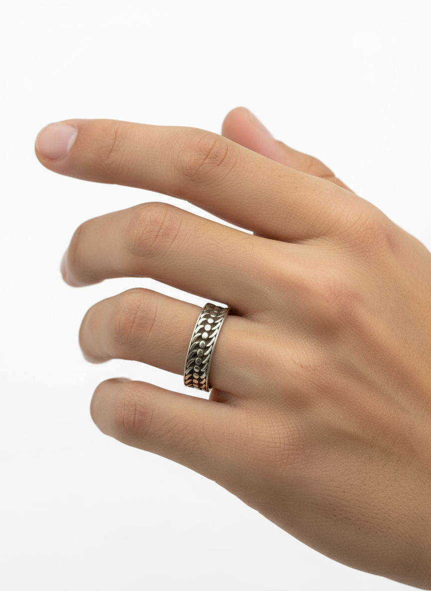 الخاتم الظاهر في الصورة هو خاتم فضي اللون بتصميم أنيق وعصري، وفيما يلي تفاصيله: