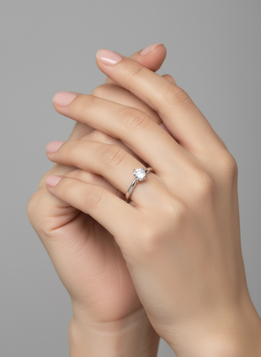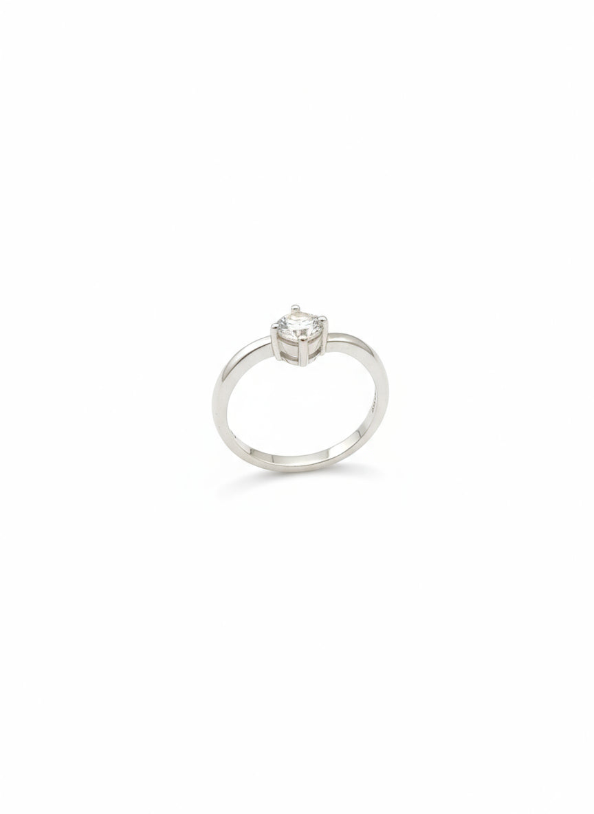 خاتم من  الفضة الإسترلينية بتصميم سوليتير كلاسيكي، يتوسطه حجر واحد لامع (غالبًا من الألماس أو الزركون) مثبت بإحكام داخل قاعدة معدنية بأربعة أو ستة أطراف (مخالب).
