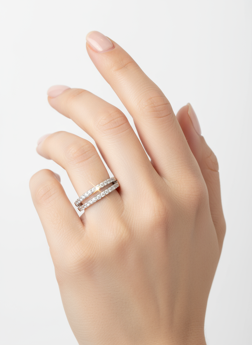 الخاتم الظاهر في الصورة عبارة عن خاتم فضي اللون بتصميم عصري مفتوح من الأمام، يتكوّن من سلكين ملتفّين بشكل أنيق على الإصبع. كل سلك مزين بصفّ من الفصوص الصغيرة اللامعة التي تشبه الزركون أو الألماس الصناعي، مما يمنحه مظهراً راقياً وبراقاً.
