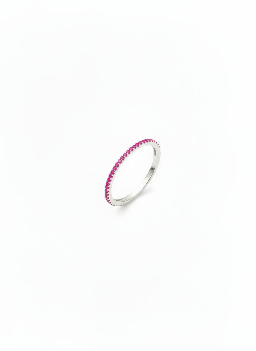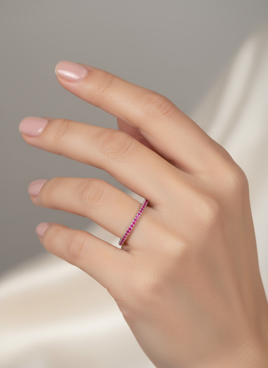 الخاتم في الصورة هو خاتم رفيع التصميم (Slim Band Ring) مصنوع  من الفضة، ويبدو مرصعًا بفصوص صغيرة باللون الوردي الفاتح أو الوردي البنفسجي على كامل محيطه، مما يمنحه مظهرًا أنيقًا وبسيطًا في الوقت نفسه.