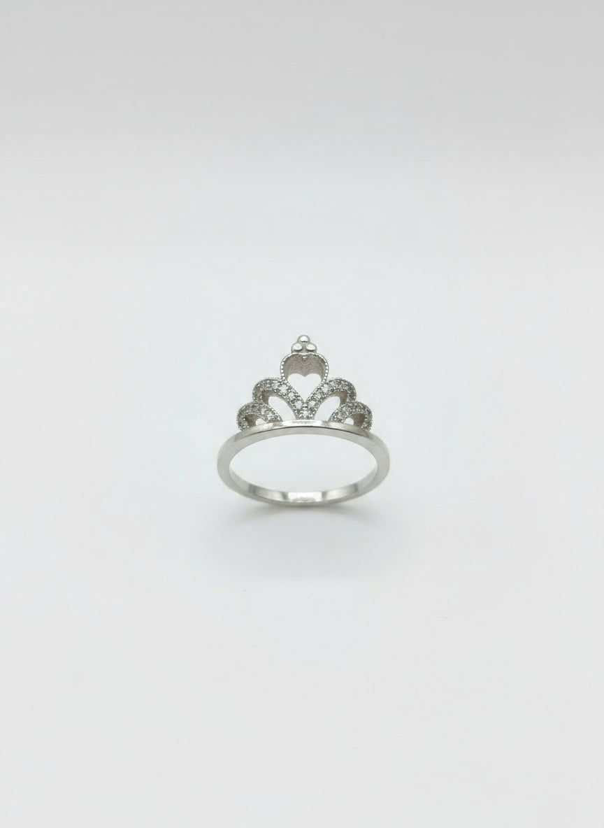 الخاتم الظاهر في الصورة هو خاتم فضة بتصميم تاج ملكي، يتميز بالتفاصيل المزخرفة الدقيقة التي تشبه التاج، مع وجود قلوب صغيرة وفصوص لامعة (غالبًا من الزركون أو الكريستال) تزين الجزء العلوي منه.