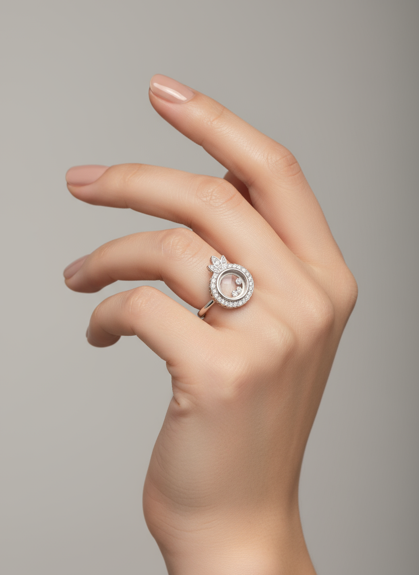 💎 التصميم: يحتوي على دائرة مجوفة في المنتصف بداخلها كرات صغيرة متحركة (غالبًا من الكريستال أو الزركون)، مما يعطيه مظهرًا حيويًا ولامعًا عند الحركة.
