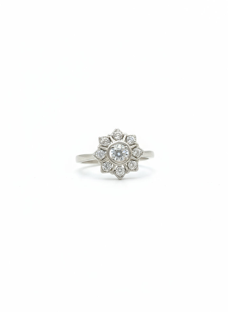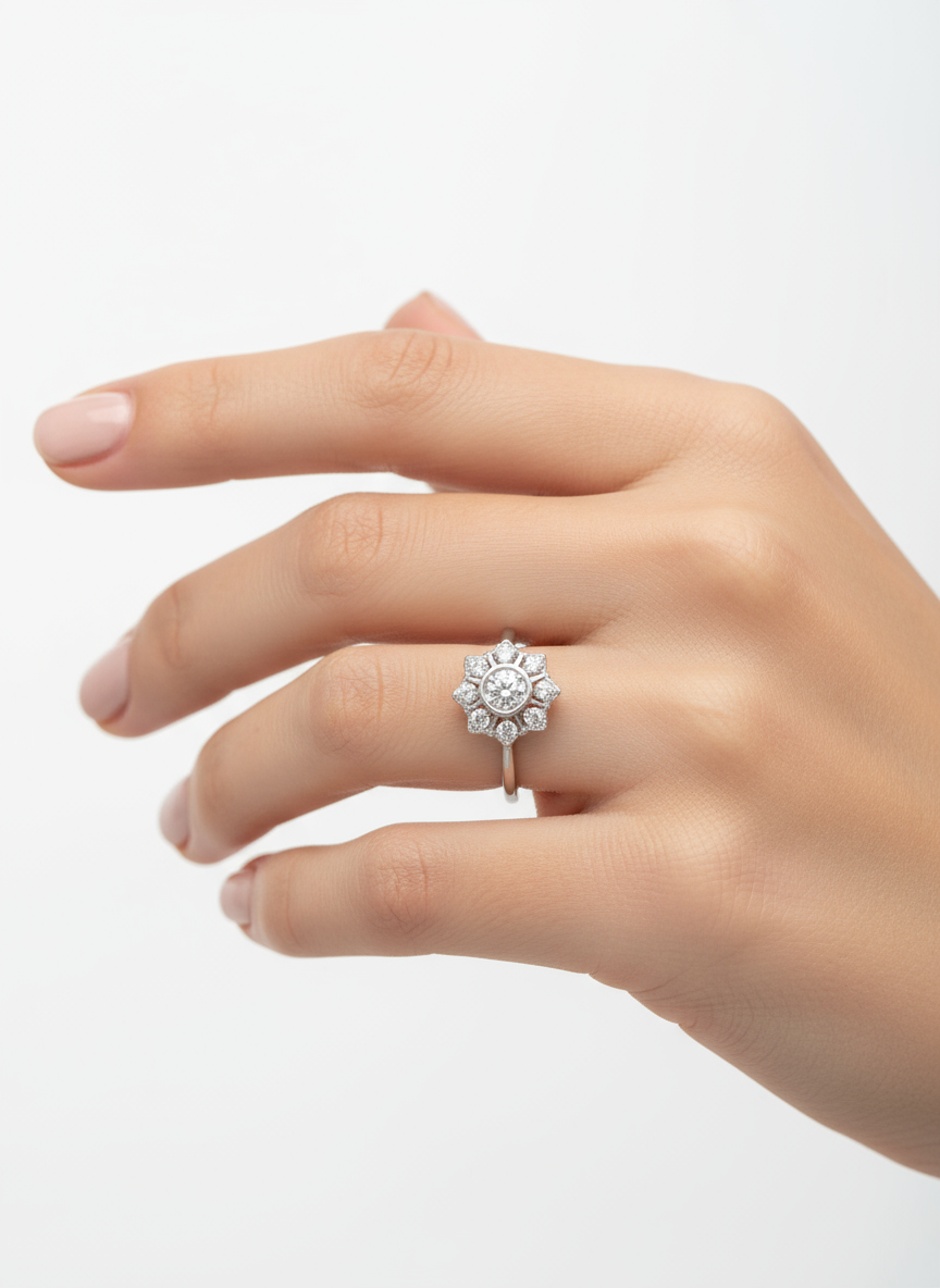 🌸 التصميم: يتخذ شكل زهرة أو نجمة، تتوسطها الماسة المركزية وتحيط بها فصوص صغيرة متراصة بشكل متناظر لتكوين بتلات براقة.