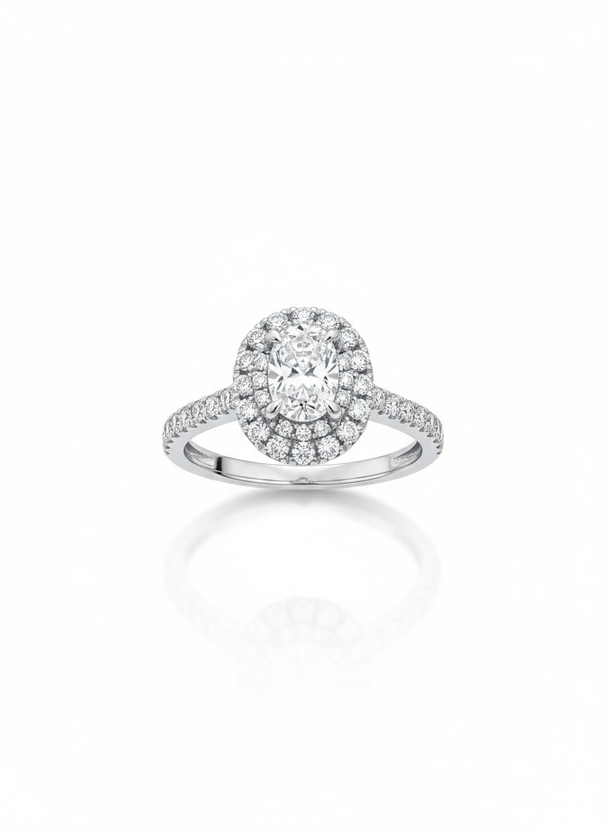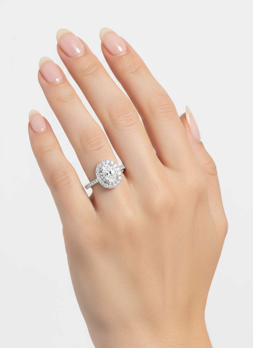 التصميم: تصميم “هالو” (Halo Design)، حيث يحيط بالحجر المركزي إطار من الأحجار الصغيرة.