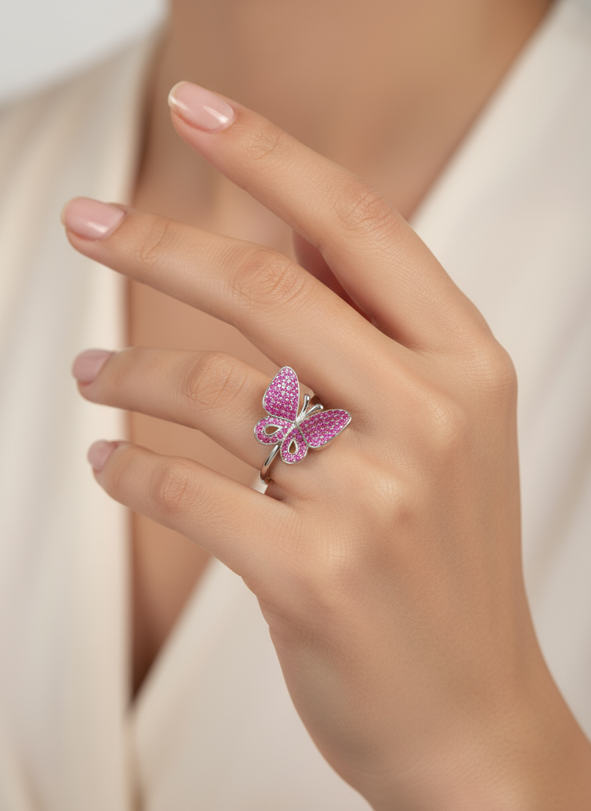 الخاتم الظاهر في الصورة هو خاتم على شكل فراشة، ويبدو أنه مصنوع من معدن لامع ي الفضة ومُزين بحبيبات زركون أو أحجار كريستالية صغيرة باللون البنفسجي الفاتح.