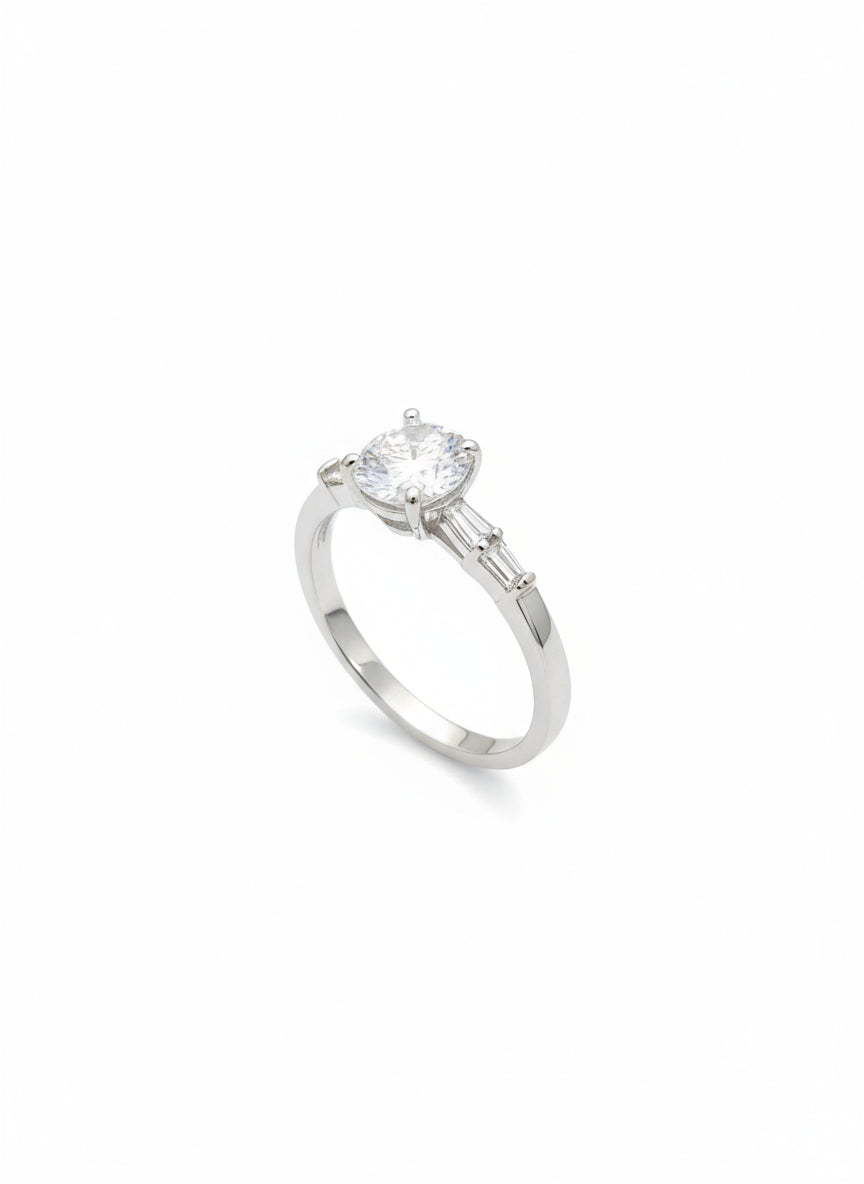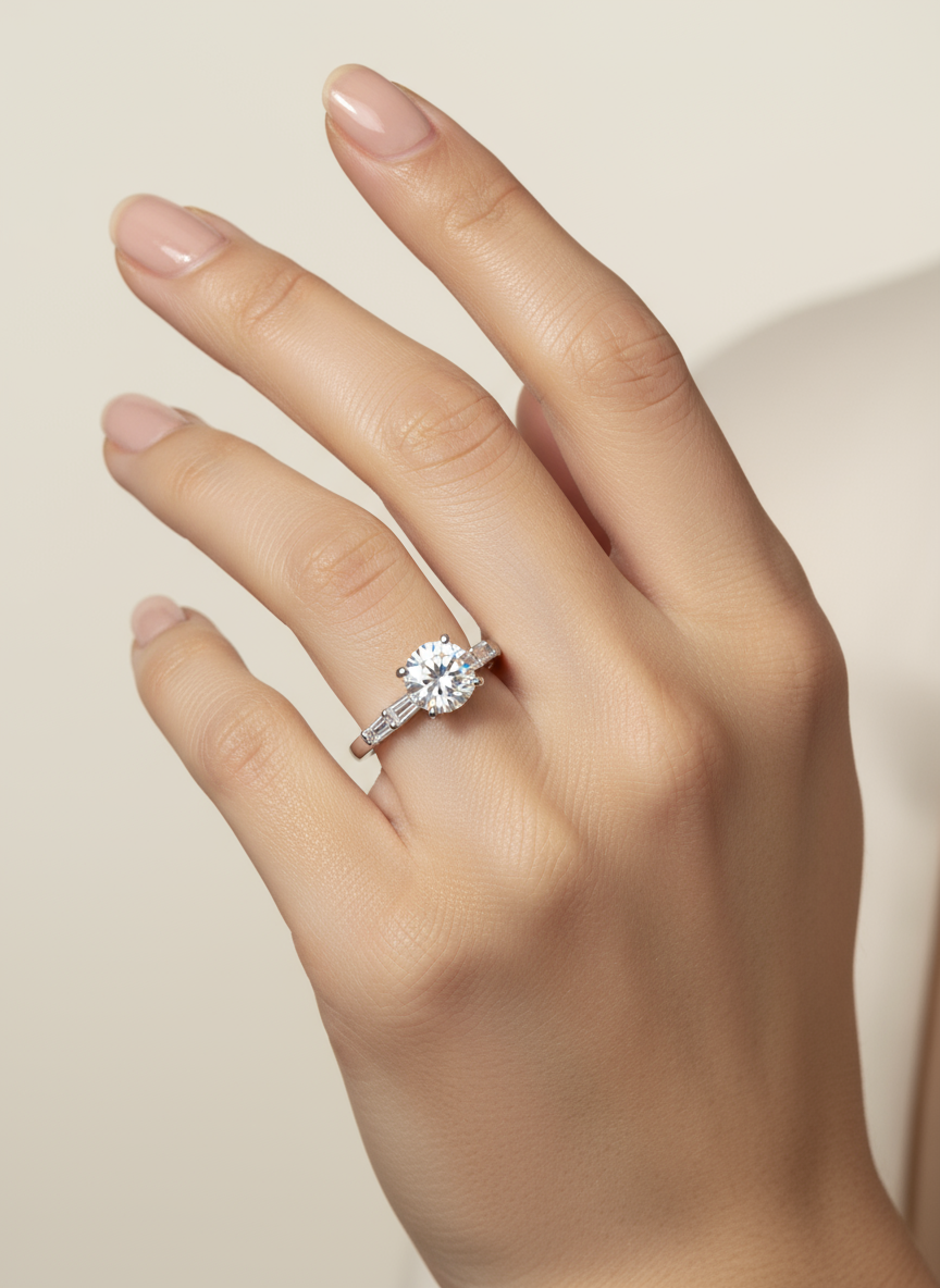🔹 تفاصيل جانبية: على جانبي الحجر الرئيسي توجد أحجار صغيرة مستطيلة الشكل (Baguette Cut stones) تضيف لمسة فاخرة وانسيابية للتصميم.