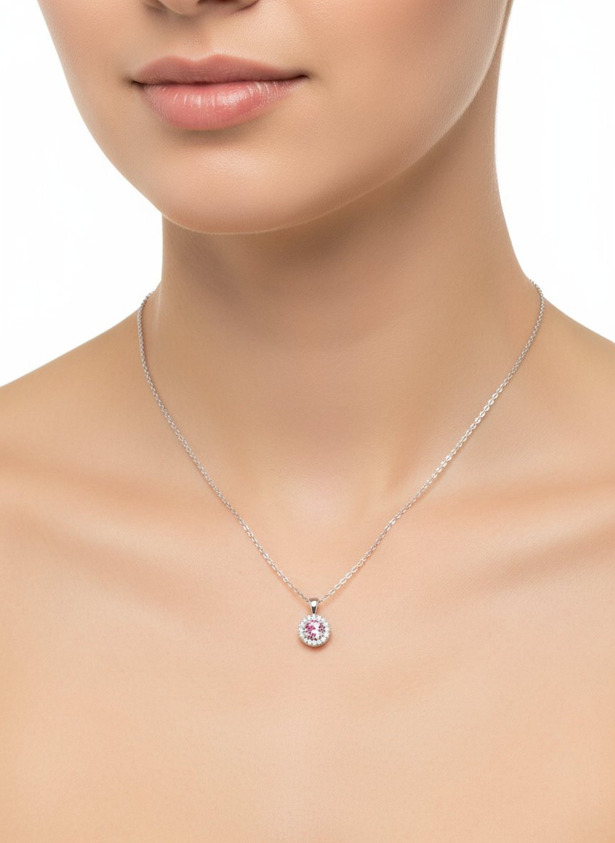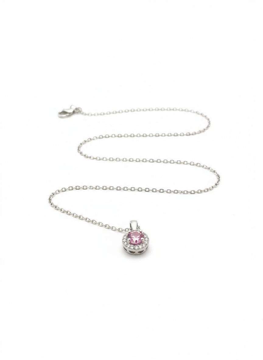 التصميم: القلادة دائرية صغيرة تتوسطها حجر بنفسجي (أرجواني) لامع — قد يكون كريستال أو زركون بنفسجي — محاط بدائرة من فصوص صغيرة شفافة تشبه الألماس الصناعي (زركون أبيض).