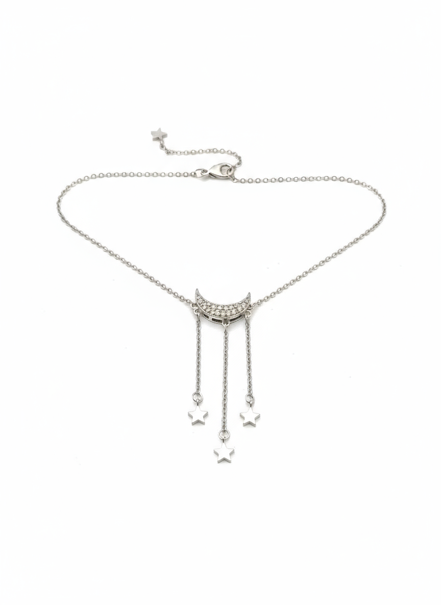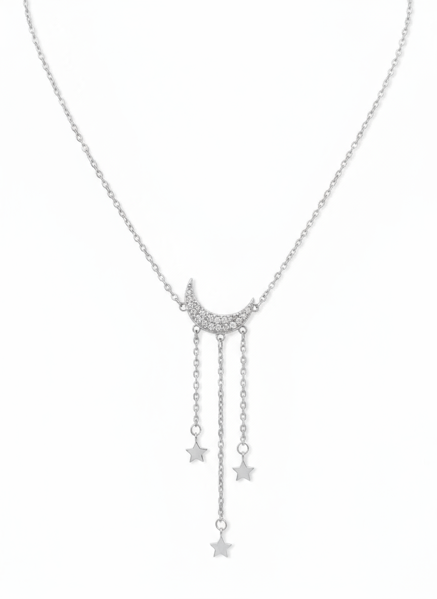 ومن الهلال تتدلى سلاسل رفيعة بها تعليقات صغيرة على شكل نجوم، تضيف لمسة ناعمة وأنثوية.