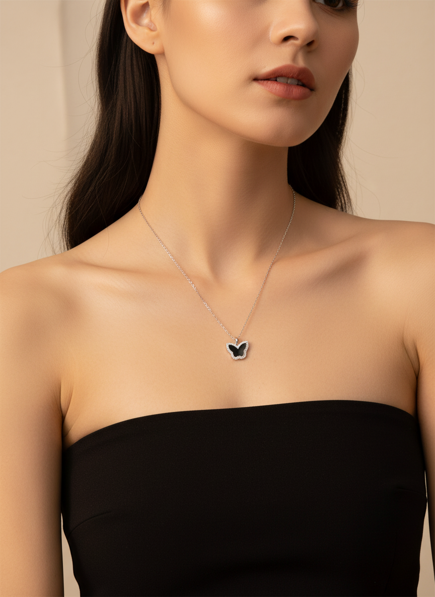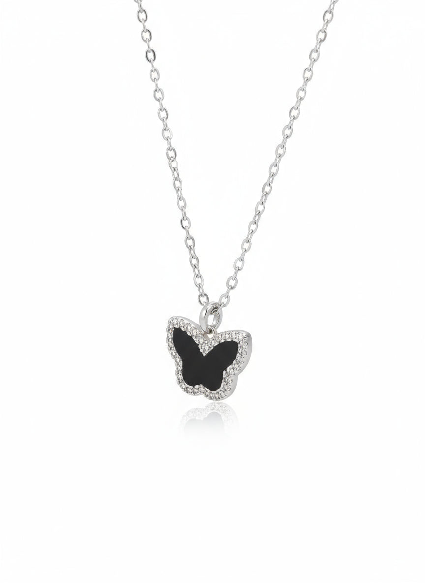 السلسلة في الصورة عبارة عن عقد نسائي أنيق يتميز بتصميم على شكل فراشة.