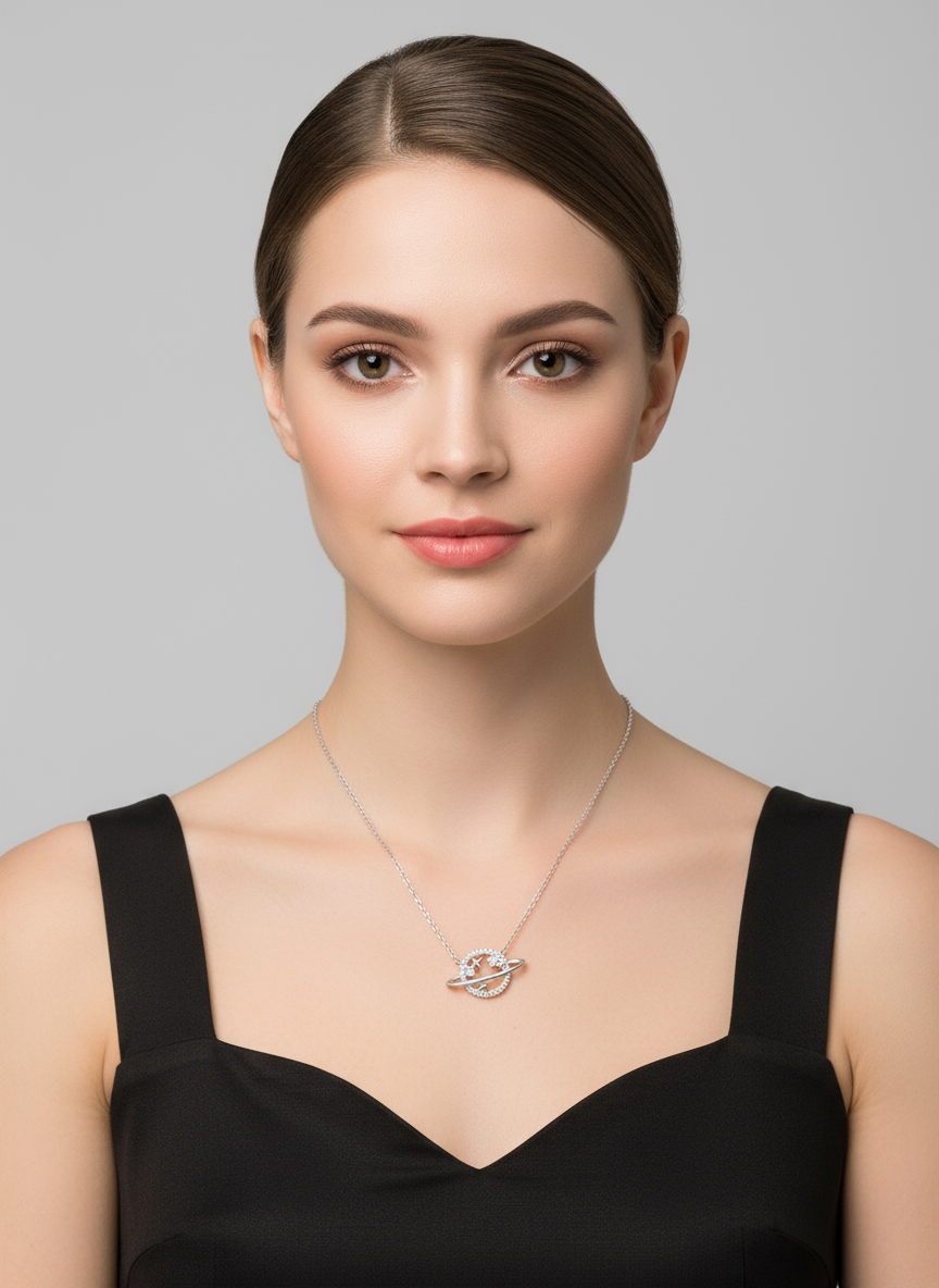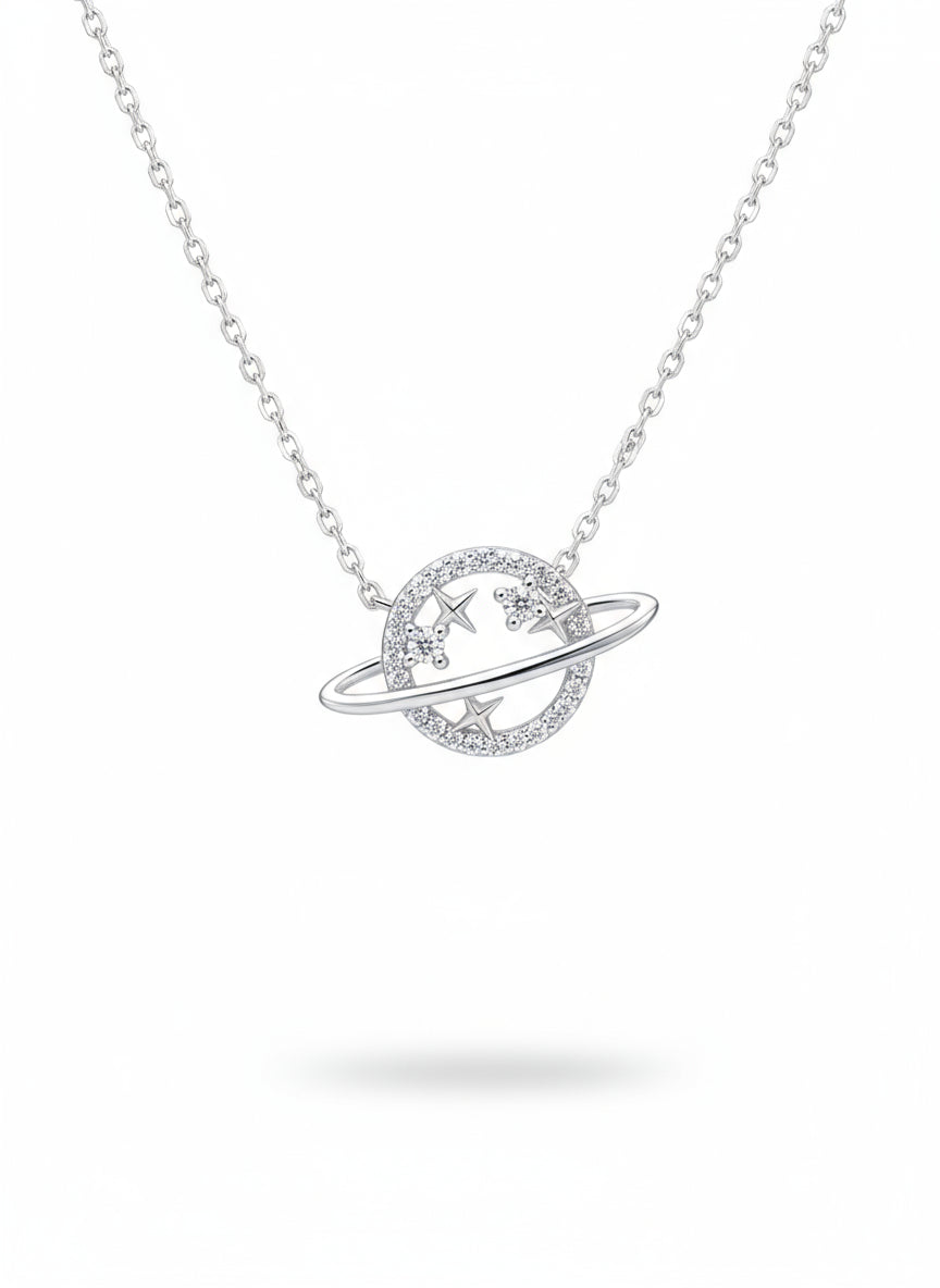 السلسلة الظاهرة في الصورة عبارة عن سلسلة فضية اللون ذات تصميم أنيق وعصري، تتميّز بتعليقة على شكل كرة محاطة بحلقة بيضاوية تشبه كوكب زحل.