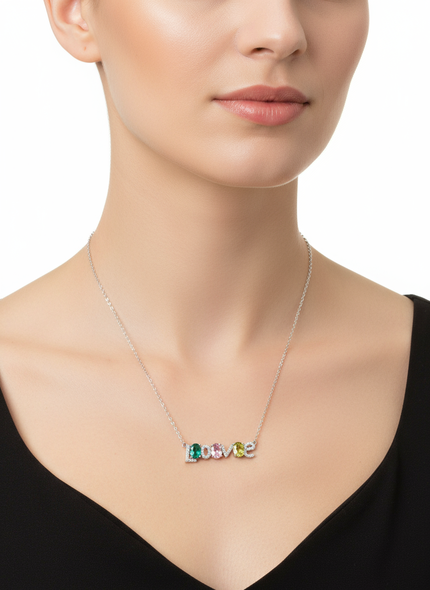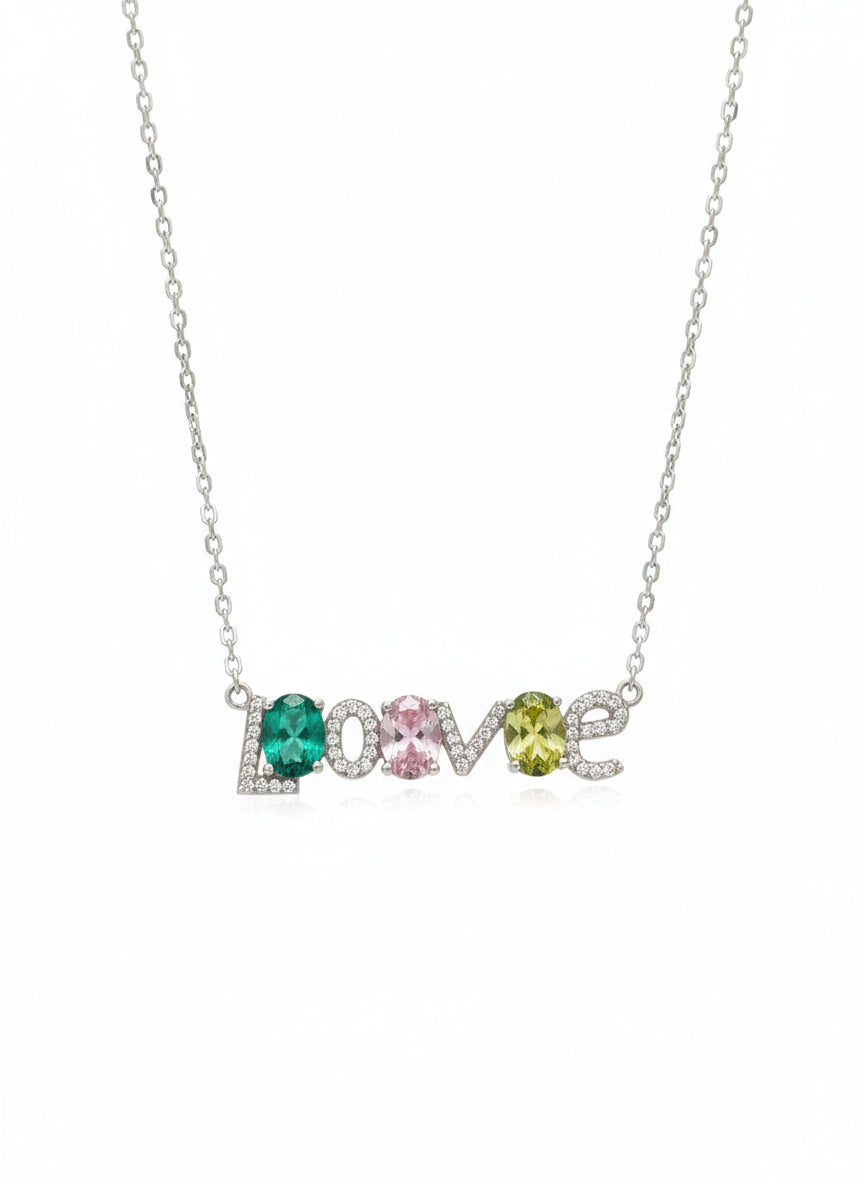 💎 التصميم: كلمة LOVE مزينة بثلاث أحجار ملونة بارزة (أخضر زمردي – وردي فاتح – أصفر مائل للأخضر).