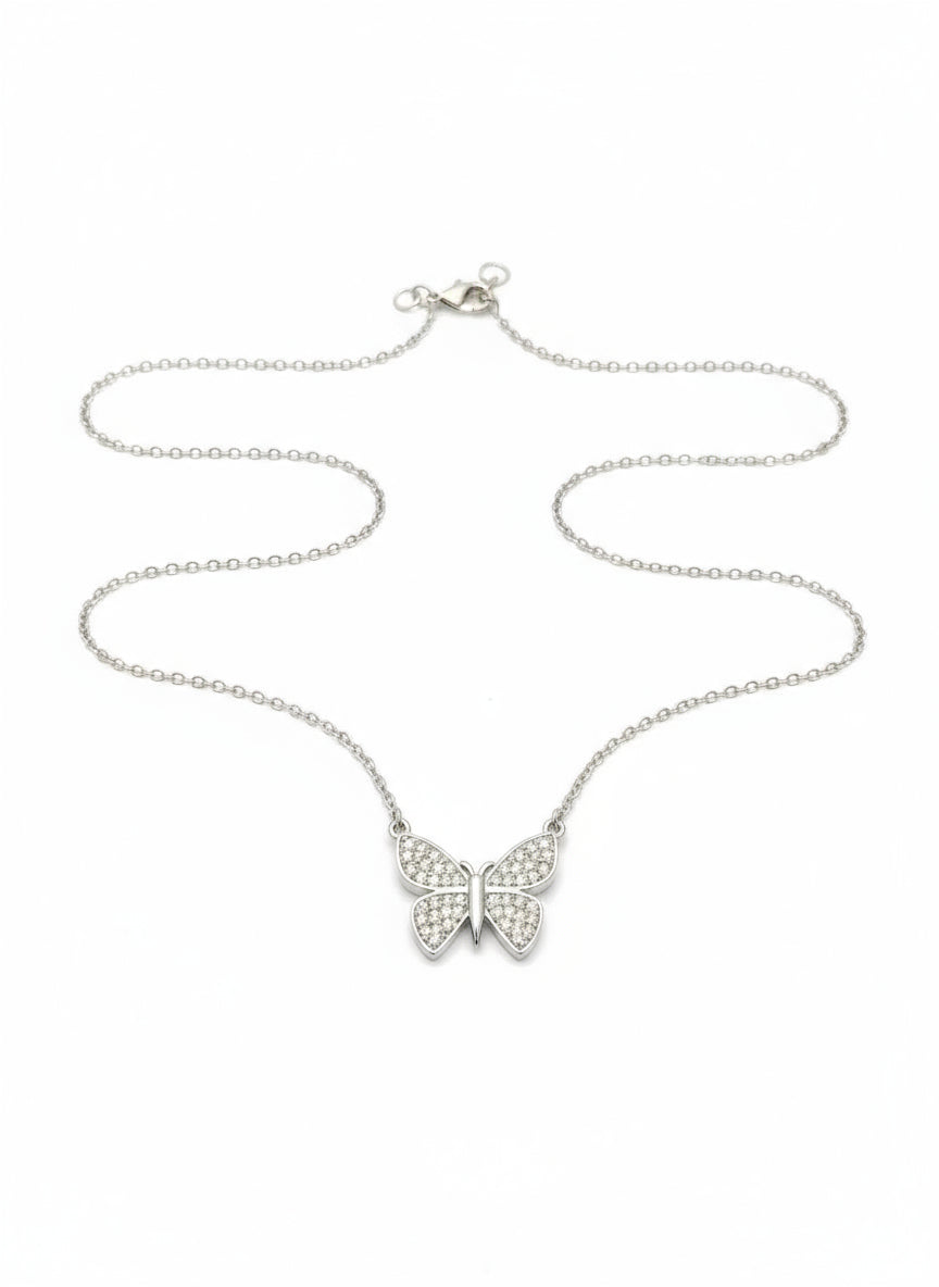 السلسلة في الصورة عبارة عن سلسلة فضية اللون بتعليقة على شكل فراشة.
