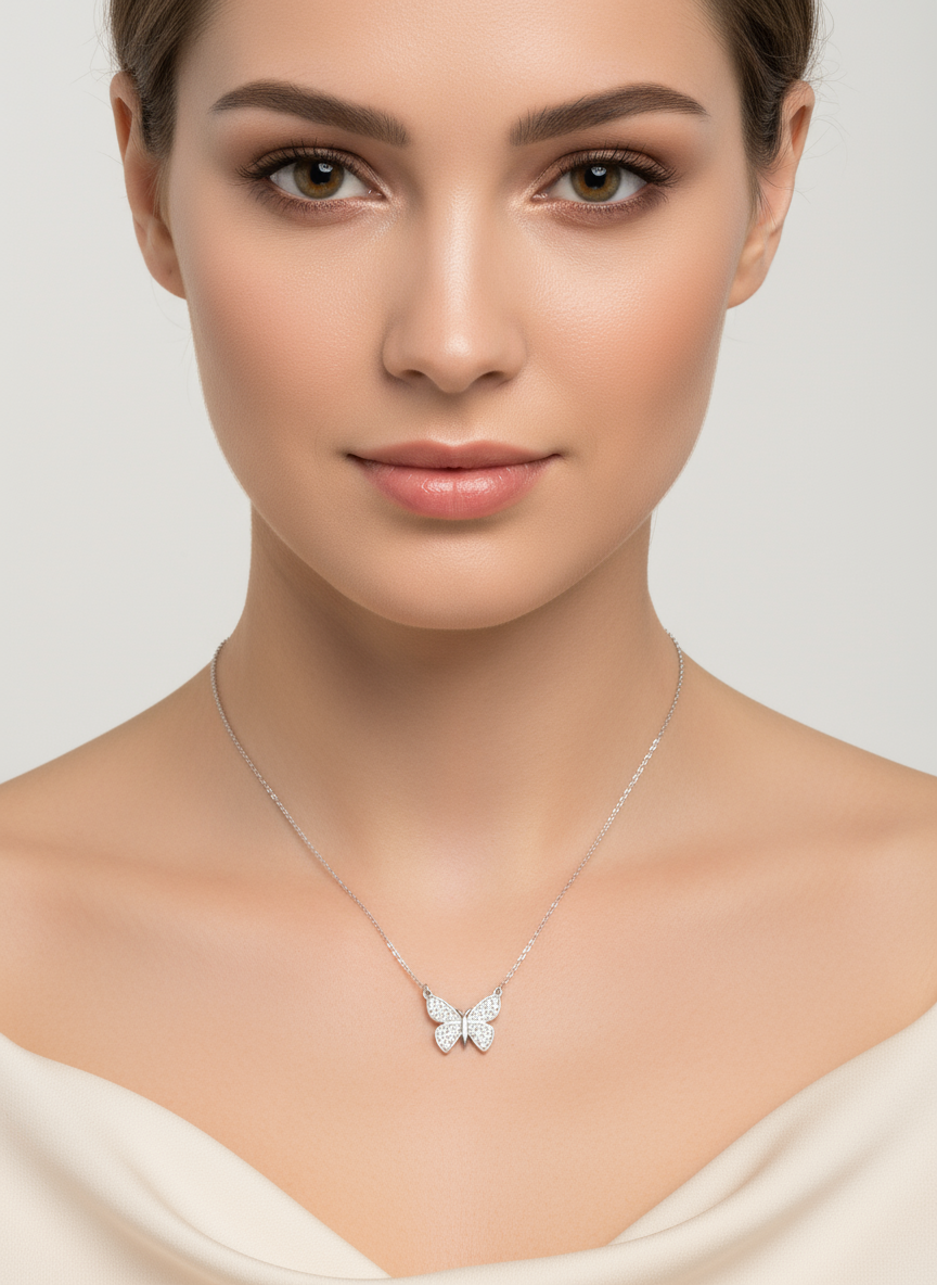 التصميم: فراشة أنيقة مجنّحة مرصّعة بفصوص صغيرة لامعة (تشبه الزركون أو الكريستال).
