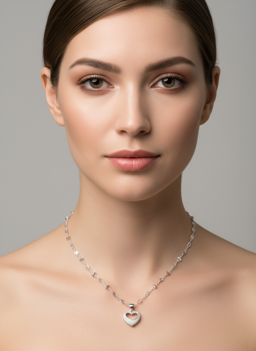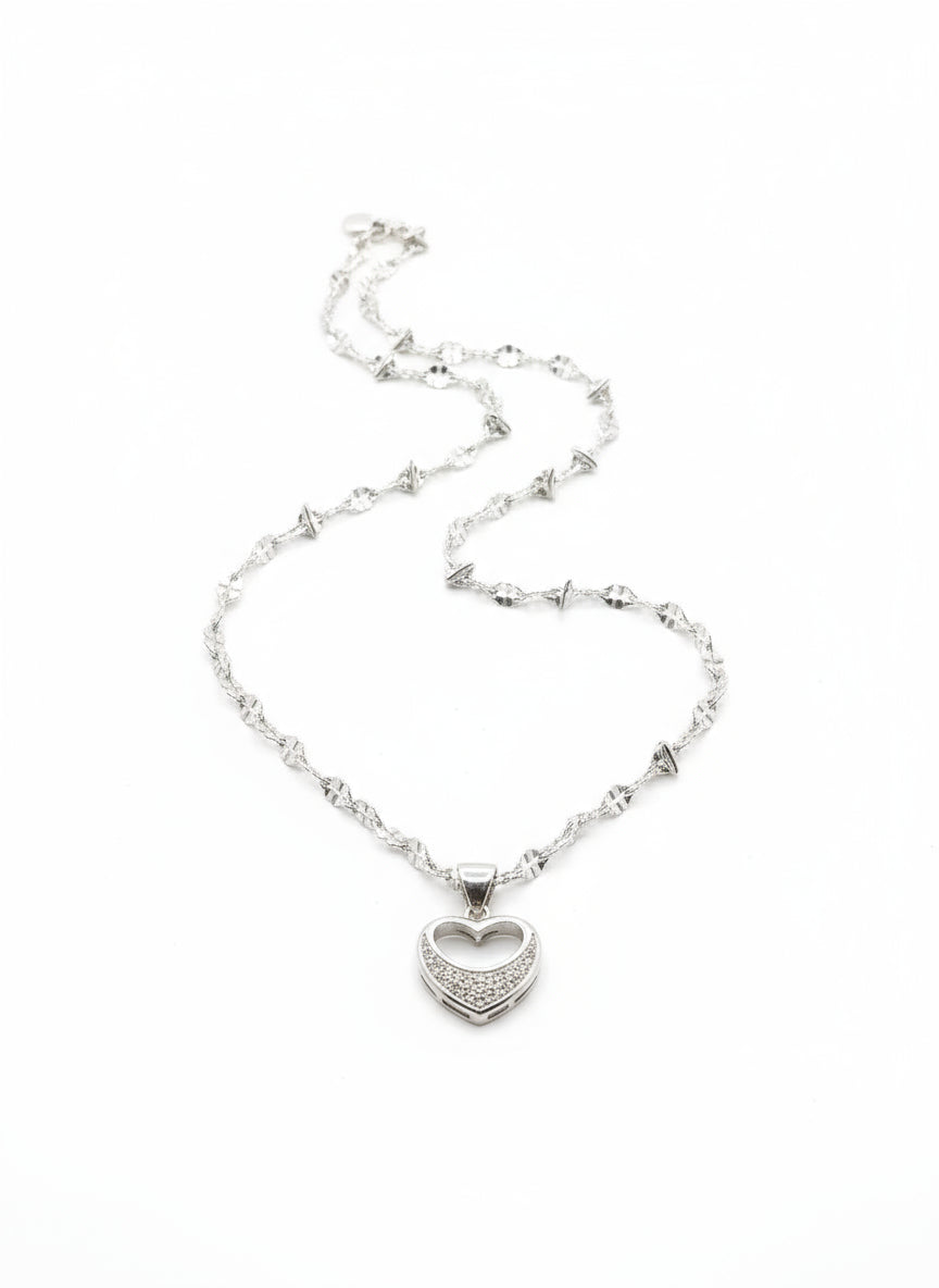 القلادة تتوسطها دلاية (بندنت) على شكل قلب مفتوح.