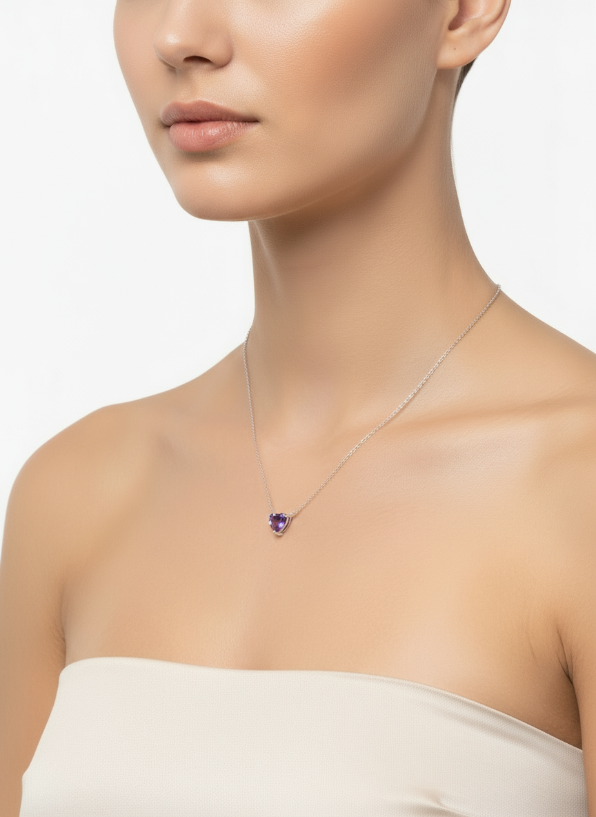 الحجر: تحتوي على حجر كريم أو زركون بنفسجي اللون مقطوع على شكل قلب، مما يمنحها مظهرًا رومانسيًا وجذابًا.
