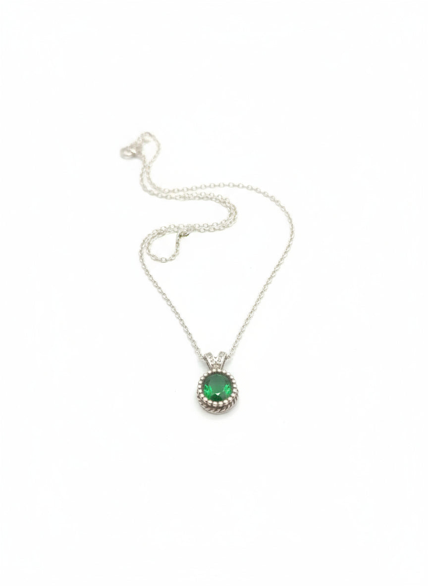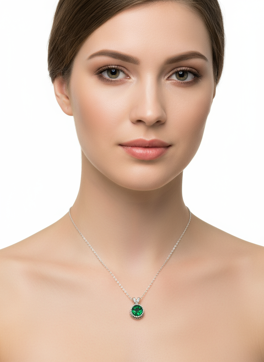 التصميم: قلادة دائرية تتوسطها حجر كريم باللون الأخضر الزمردي، يحيط به إطار مزين بكرات صغيرة متناسقة تضيف لمسة فخمة.