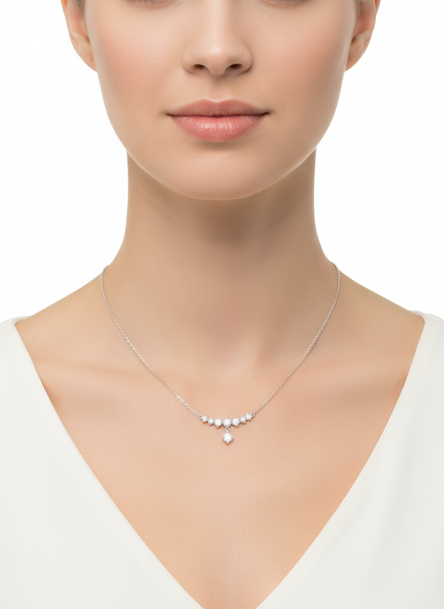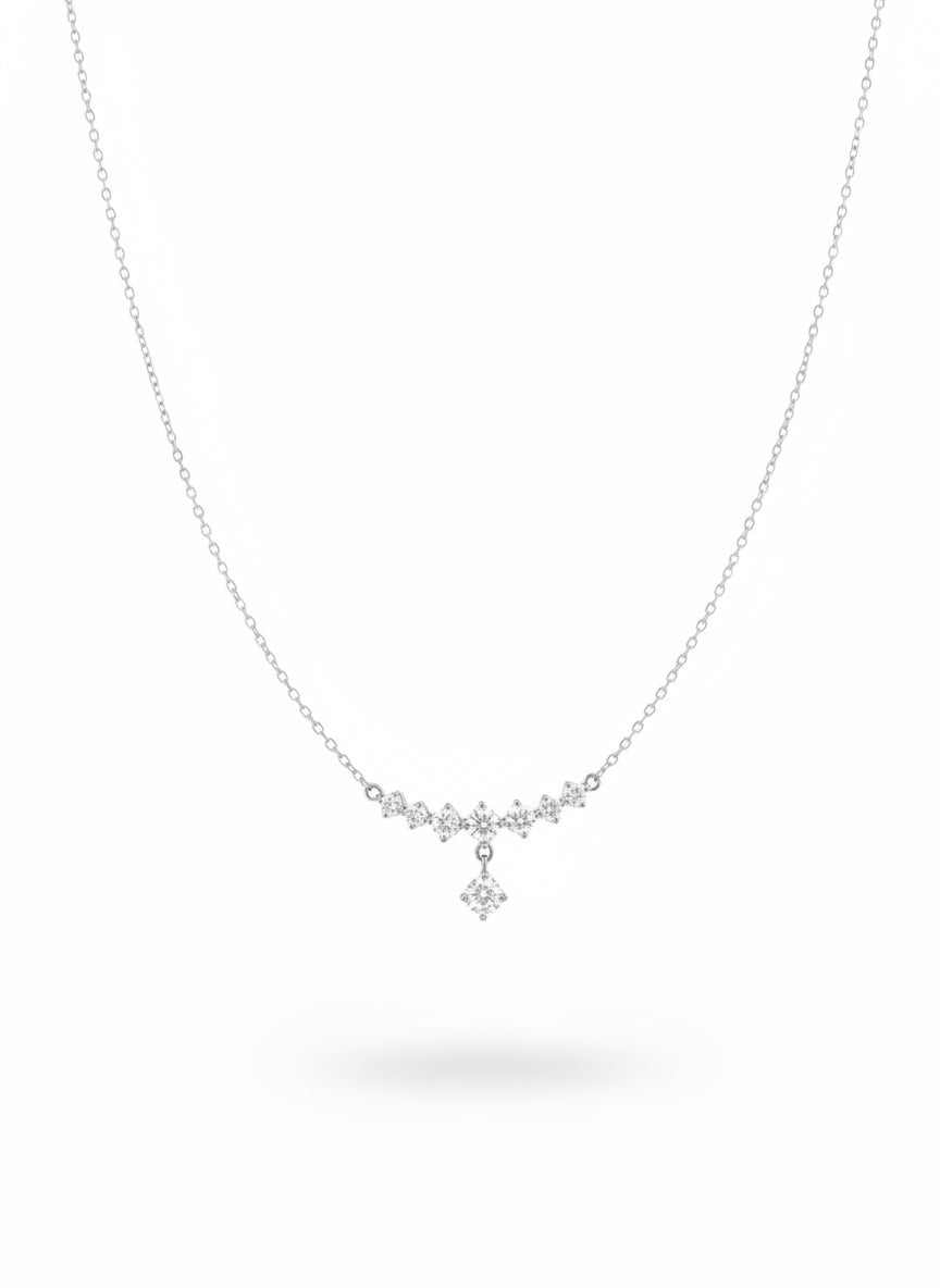 🔹 التصميم: تتكون من سلسلة رفيعة يتدلى منها جزء مركزي مرصع بفصوص صغيرة تشبه الألماس أو الزركون الأبيض، بتصميم متناسق يعطي لمسة فخمة.