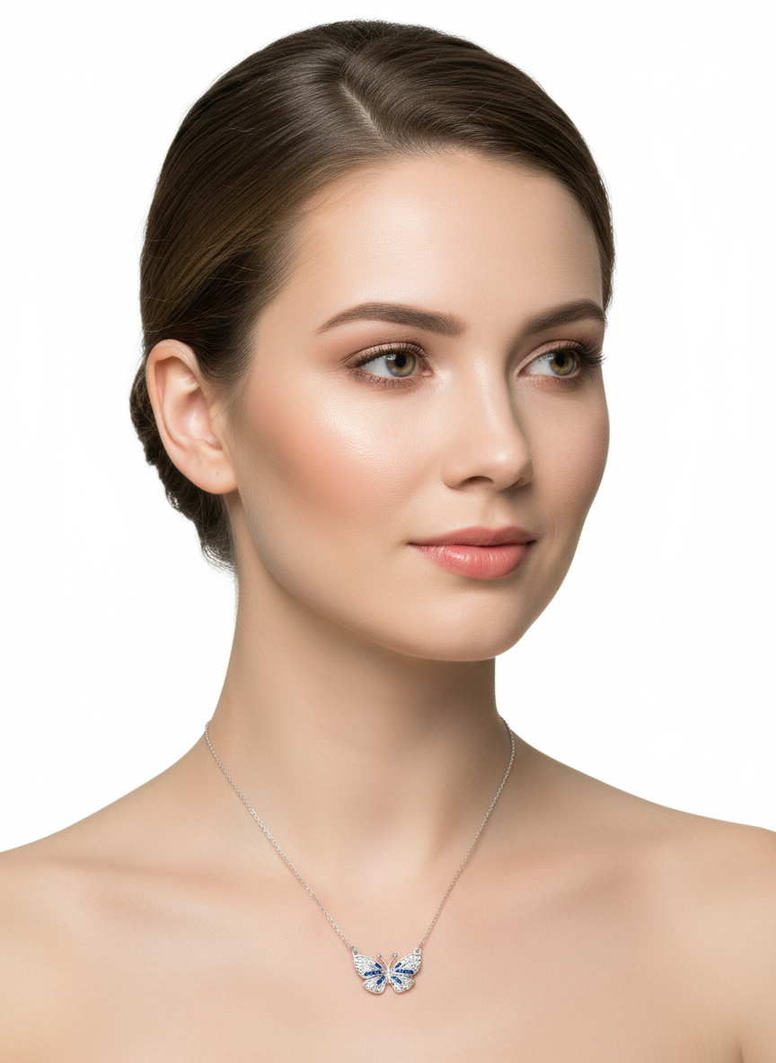 🔹 التصميم: شكل فراشة مزينة بفصوص لامعة من الزركون الأبيض والأزرق تضيف بريقًا مميزًا.