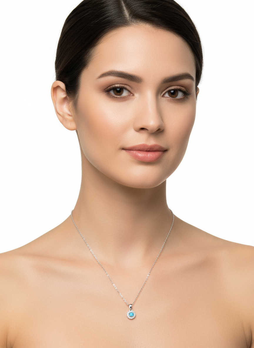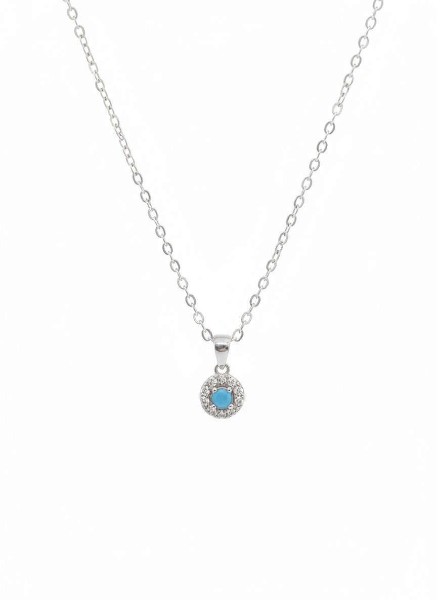 القلادة (البندنت): دائرية الشكل، تحتوي في الوسط على حجر أزرق صغير (يشبه الفيروز أو التوباز الأزرق)، محاط بأحجار بيضاء لامعة تشبه الزركون أو الكريستال.