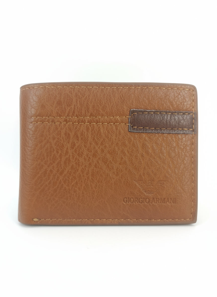 المحفظة الظاهرة في الصورة من نوع Giorgio Armani، وهي من الجلد الطبيعي بلون بني كلاسيكي مع خياطة ظاهرة بلون أصفر مائل للذهبي على الحواف.