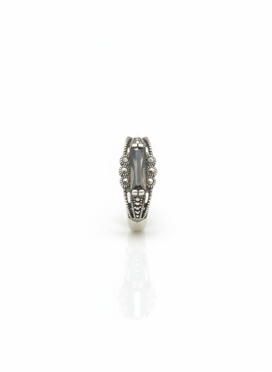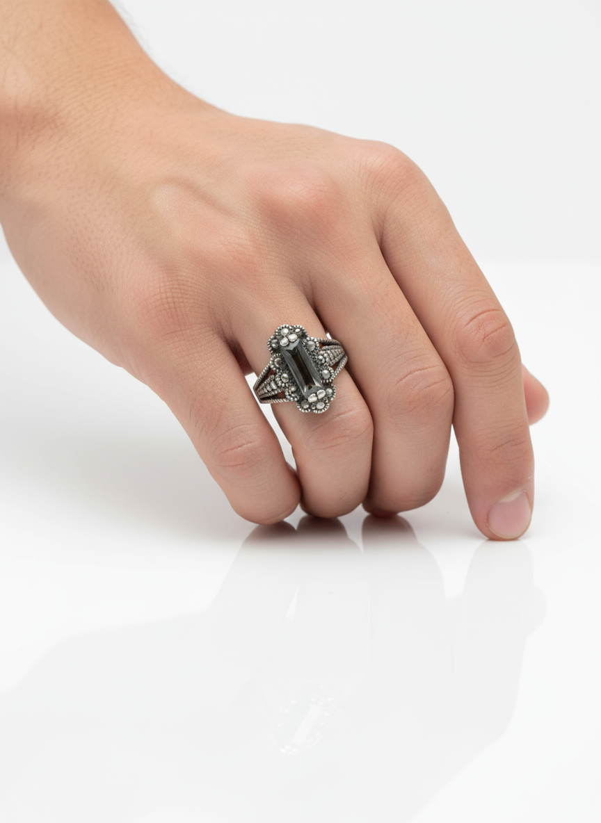 🔹 الحجر: حجر أسود لامع مستطيل الشكل، يحتل منتصف الخاتم ويمنحه مظهرًا راقيًا